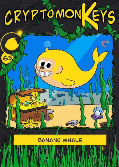 Banano Whale is the #65 card and is part of the fourth generation of cards in the CryptomonKeys series. Banano Whale was released in October 6, 2021 and is a epic card with a maximum of 91 mints. This card has the description: "Whale Alert!" and was created by Kinnester and [[SoggyApplePie]].