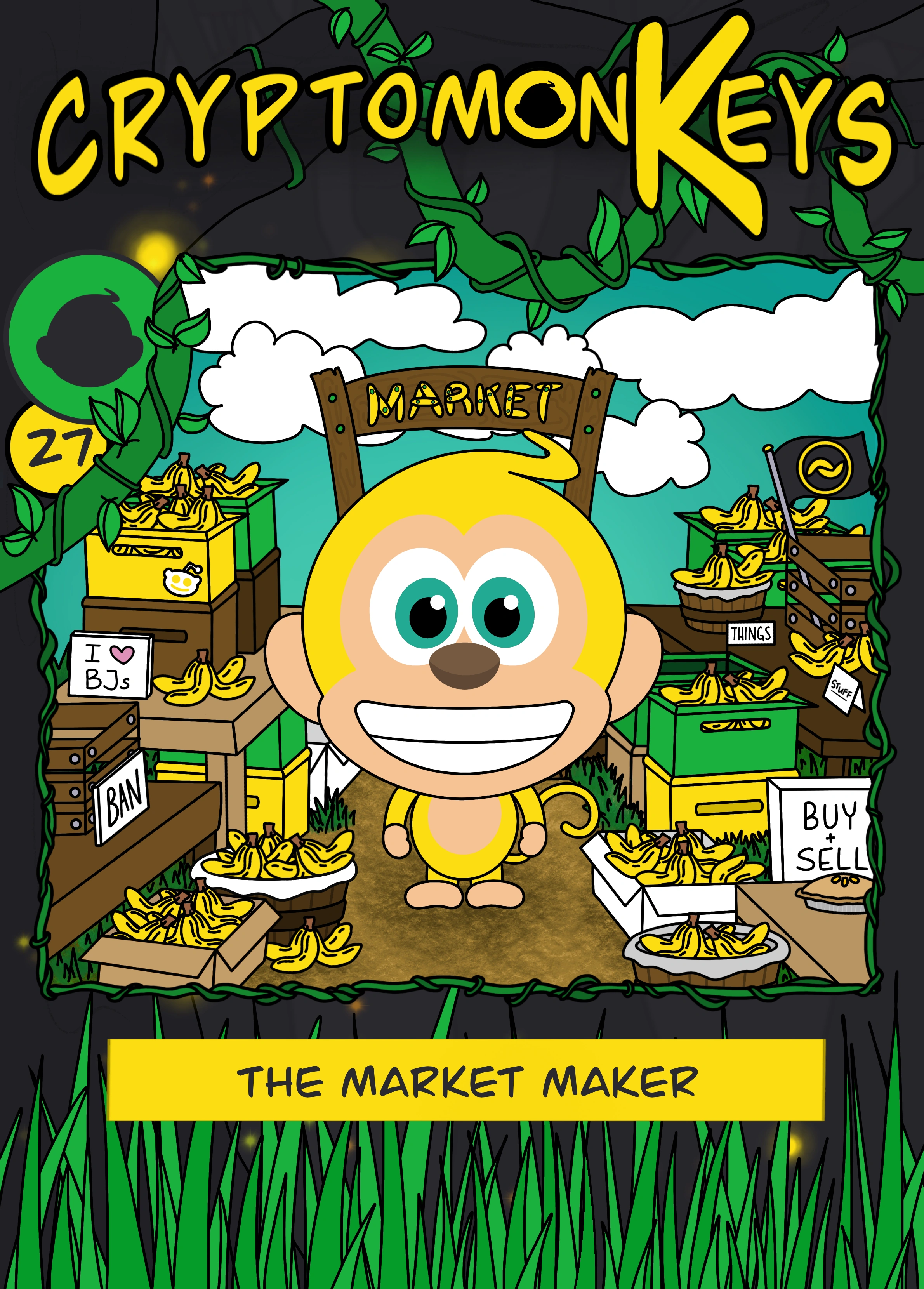 The Market Maker is the #27 card and is part of the second generation of cards in the CryptomonKeys series. The Market Maker was released in December 23, 2020 and is a common card with a maximum of 9,119 mints. This card was created by SoggyApplePie.